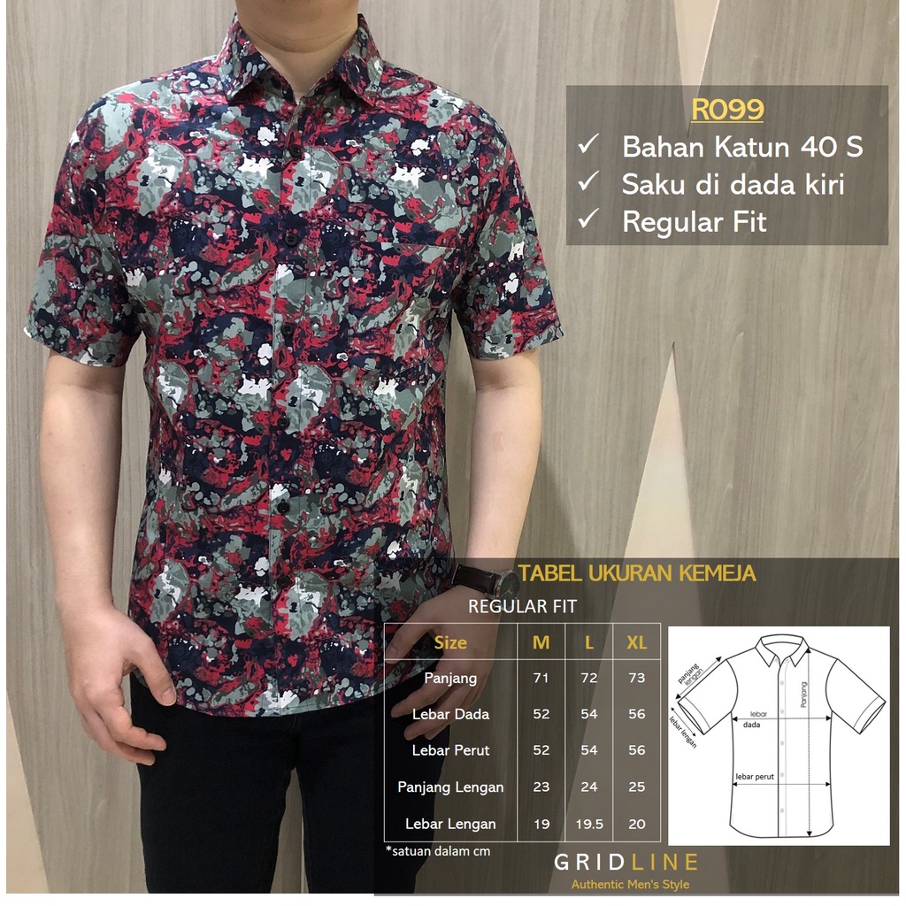 [GRIDLINE R099 - R020] Kemeja Batik Pria Katun Lengan Pendek Regular